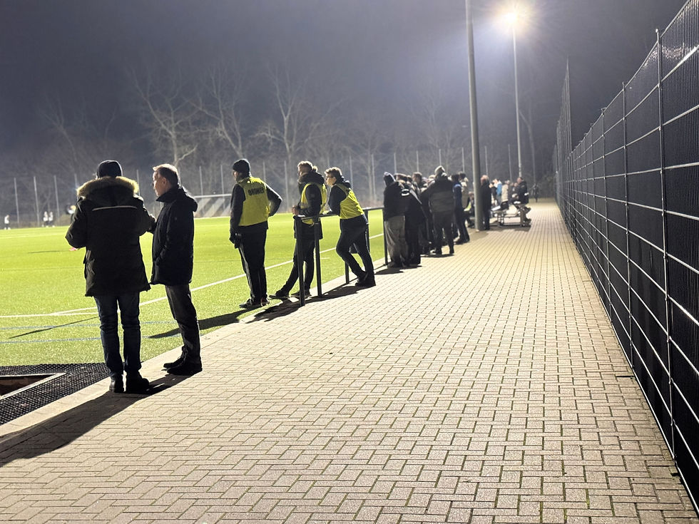 Der Platz selbst ist eher öde. Es ist ein eingezäunter 08/15-Kunstrasenplatz ohne Flair. Davor sind ein paar Fitnessgeräte, die zu meinem größten Erstaunen, bei der Arschkälte und Dunkelheit von ein paar Kerlen genutzt wurden. Immerhin gibt es auch eine Anzeigetafel und eine Tribüne. Ja, tatsächlich, dreireihig mit 24 Sitzschalen und echt niedlich.